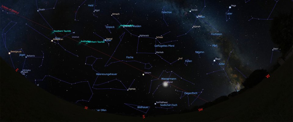 Die Sommersternbilder stehen in der westlichen Himmelshälfte, die Herbststernbilder und die Andromedagalaxie sind am Osthimmel auffindbar. Die kraterzerfurchte Mondoberfläche, Jupiter am späten Abend und der Ringplanet Saturn sind Objekte des Abendhimmels.