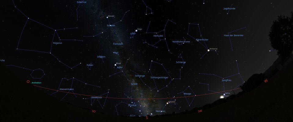Die Milchstraße mit dem Sommerdreieck und dem Schützen steht im Süden, Stätten von Sternengeburt und Sternentod sowie Offene und Kugelsternhaufen sind Teil dieser Deep-Sky-Nacht. Am frühen Abend kommt der Ringplanet Saturn über den Horizont.