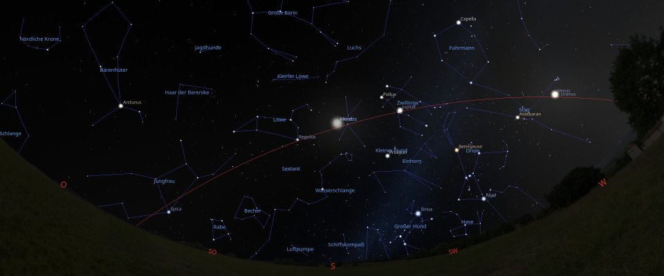 Die Frühlingssternbilder dominieren den Himmelsanblick, Galaxien in Löwe, Jungfrau und Haar der Berenike, Kugelsternhaufen im Herkules, Objekte im Großen Wagen und in den Jagdhunden sowie Mond, Venus und Jupiter sind Objekte dieser Führungsnacht.