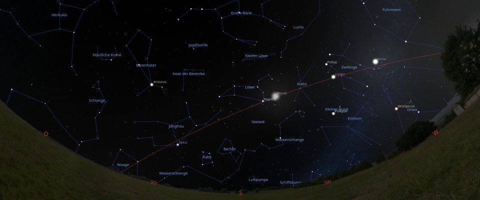 Die Frühlingssternbilder dominieren den Himmelsanblick, Galaxien in Löwe, Jungfrau und Haar der Berenike, Kugelsternhaufen im Herkules, Objekte im Großen Wagen und in den Jagdhunden, die kraterzerfurchte Mondoberfläche sowie Venus und Jupiter sind Teil dieser Führungsnacht.