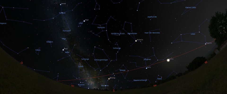 Das Sommerdreieck, der Schütze und die Milchstraße prägen den Himmelsanblick, Sternengeburt und –tod, Offene und Kugelsternhaufen – ein Beobachtungsparadies auch für Ferngläser. Venus am frühen Abendhimmel und der Ringplanet Saturn am späten Abendhimmel können beobachtet werden.