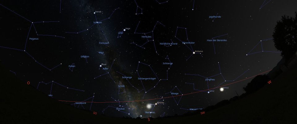 Die Milchstraße mit dem Sommerdreieck und dem Schützen steht im Süden, Stätten von Sternengeburt und Sternentod sowie Offene und Kugelsternhaufen sind Teil dieser Beobachtungsnacht. Die Mondoberfläche mit ihren Kratern begeistert, der „Abendstern“ Venus geht früh am Abend unter, der Ringplanet Saturn kommt am späten Abend hoch.